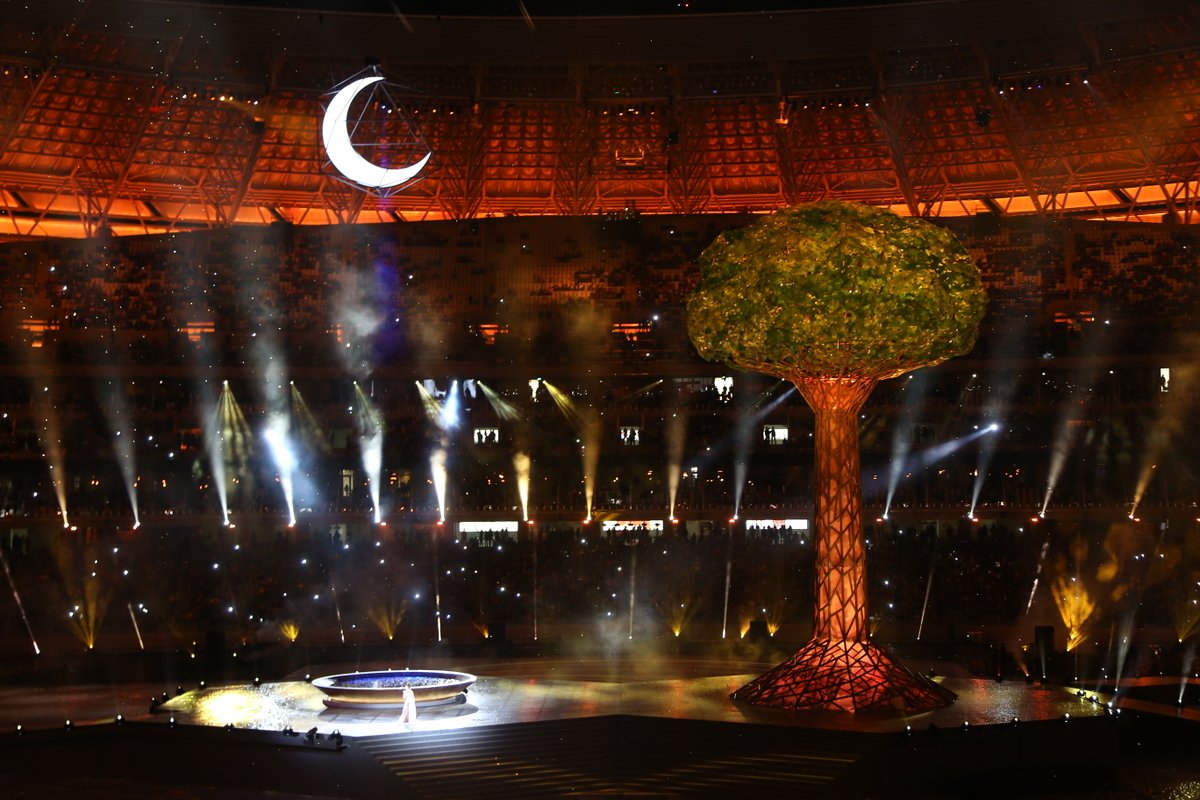 Tören, 2021'de 5. İslami Dayanışma Oyunları ev sahipliği yapacak İstanbul'la ilgili videonun gösterilmesi ve İslami Dayanışma Oyunları Federasyonu (ISSF) Genel Sekreteri Faysal el-Nasar'ın ISSF bayrağını, Türkiye Gençlik ve Spor Bakanlığı Müsteşar Yardımcısı Kamuran Özden'e takdim etmesiyle devam etti. Ardından Türk bayrağı, havai fişek eşliğinde göndere çekildi ve İstiklal Marşı seslendirildi.