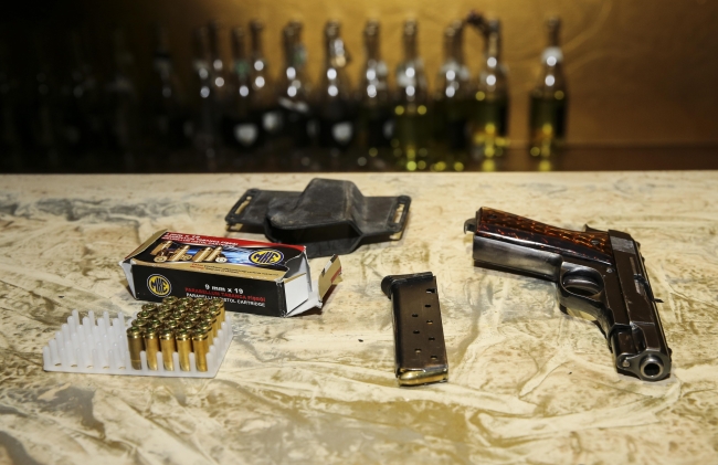 Eğlence merkezinde yapılan aramada 2 pompalı tüfek ve bu tüfeklere ait 75 av fişeği bulan ekipler, iş yerinin bar kısmındaki sandalye döşemesinin içine gizlenmiş halde bir tabanca ve bu tabancaya ait şarjör ile kutu içerisinde 9 milimetre çapında 32 fişek ele geçirildi.