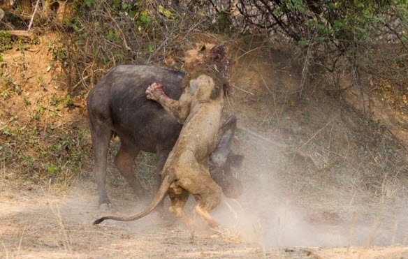 41101Çalıların arasında pusuya yatan aslan tek sandığı bufalonun üzerine atladı. Fakat durum hiç sandığı gibi olmadı..
