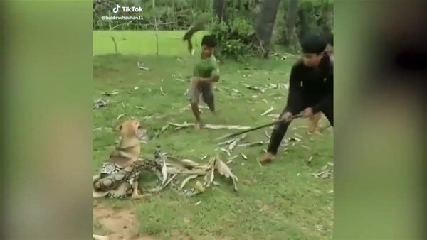 Sımsıkı saran yılanı gören insanlar köpeği kurtarmak için böyle çaba sarfetti.