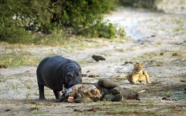 Aç su aygırı aslana, yemeğin onun olduğunu haykırırcasına anlatmaya çalışıyor...