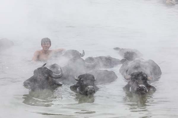 Dondurucu soğukta manda ve atların kaplıca keyfi