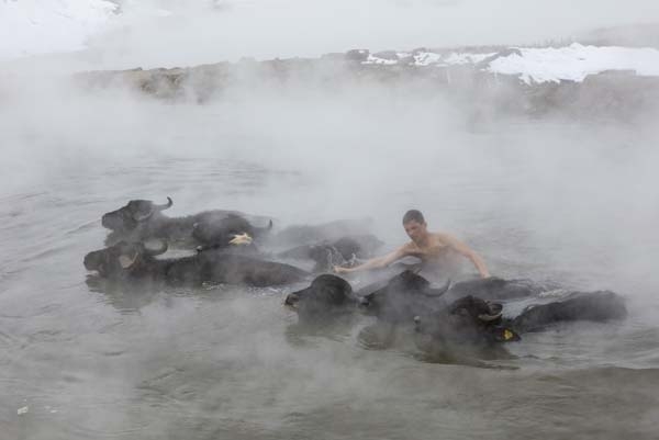 Dondurucu soğukta manda ve atların kaplıca keyfi