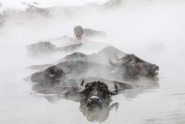 Dondurucu soğukta manda ve atların kaplıca keyfi