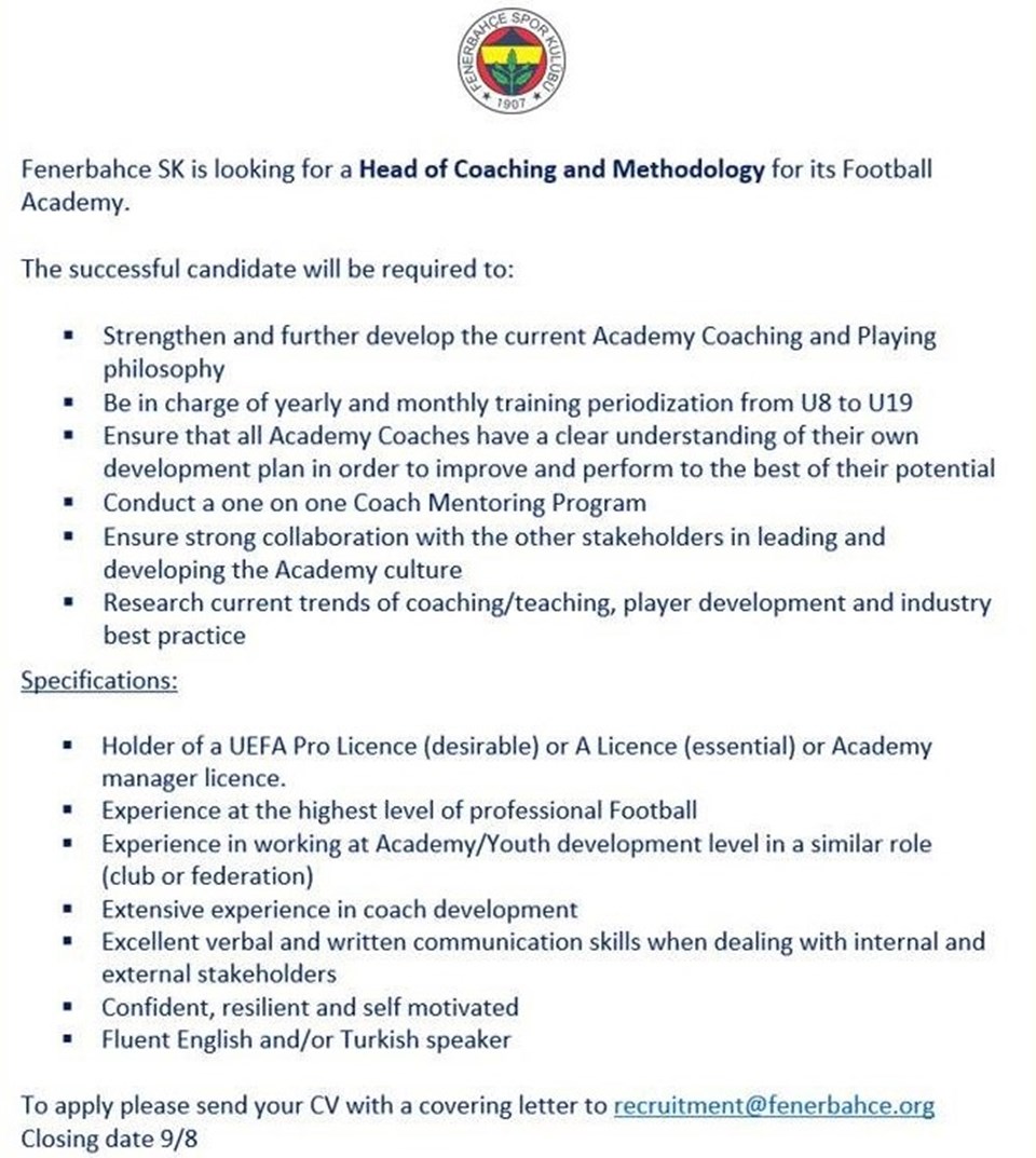 Sportif Direktör Comolli'nin verdiği ilanda, altyapı hocası için aranan özellikler şu şekilde sıralandı ve ilan ile ilgilenenlerin 9 Ağustos tarihine kadar CV göndermeleri belirtti.