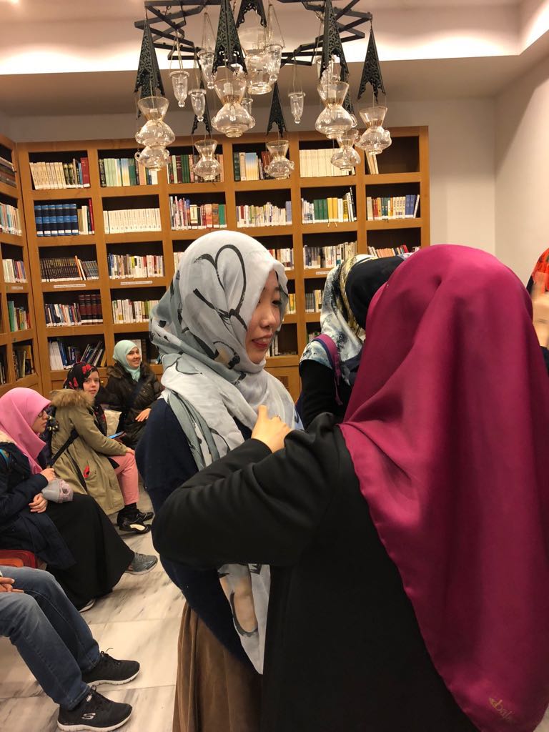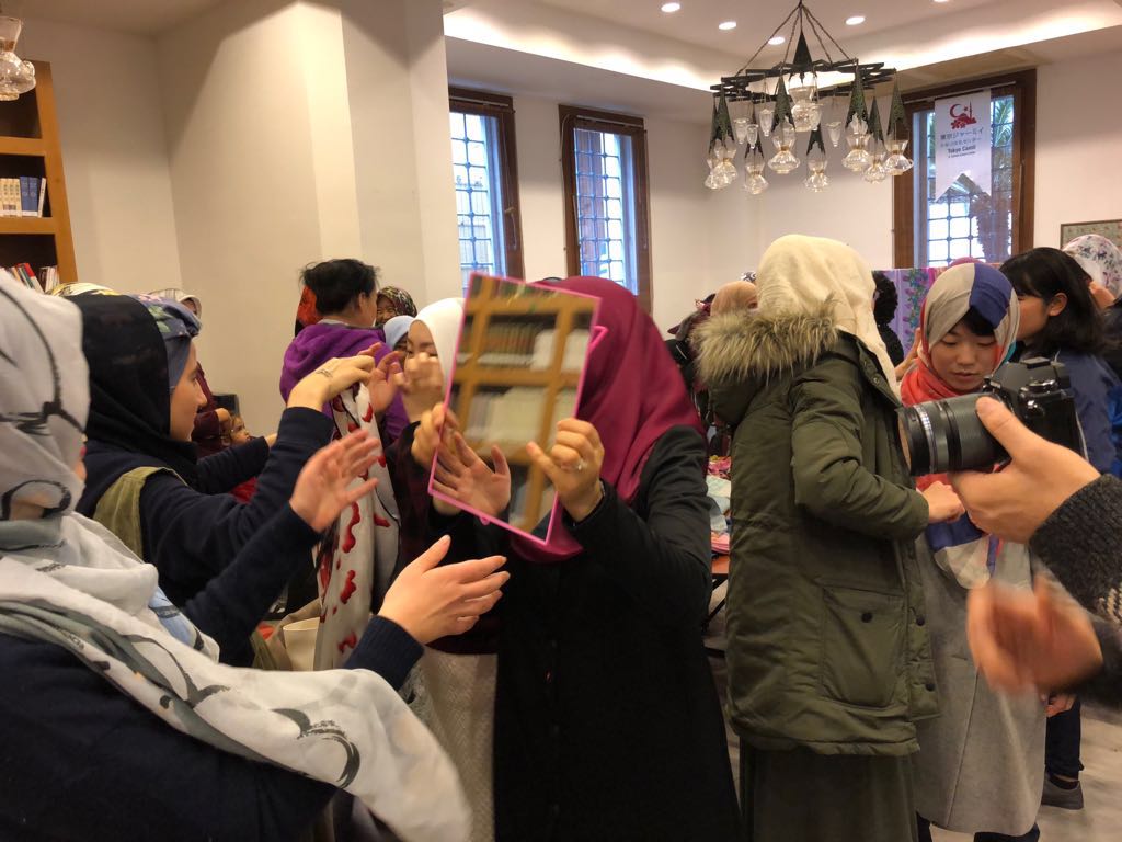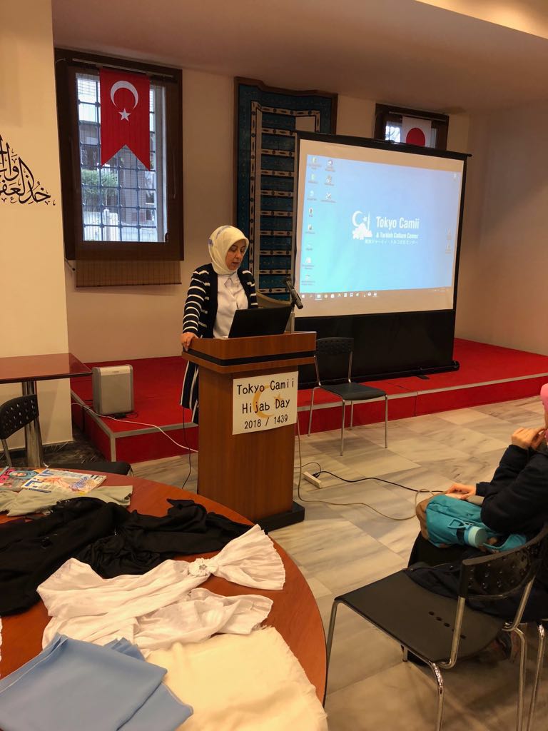 Japon vatandaşlarına örtünmenin geçmişini anlatan Mercan, örtünmenin Hz.Adem ve Havva ile başladığını ve Kur'andaki yerini anlattı.