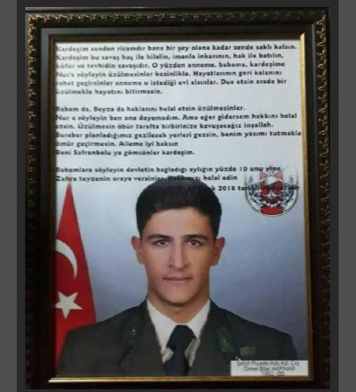 Türk Silahlı Kuvvetleri'nin (TSK) Suriye'nin Afrin'de sürdürdüğü "Zeytin Dalı Harekatı"nın 19'uncu gününde şehit olan, cenazesi geçen parşembe günü Karabük'te toprağa verilen 22 yaşındaki Piyade Astsubay Kıdemli Çavuş Ömer Bilal Akpınar'ın vasiyeti ortaya çıktı.